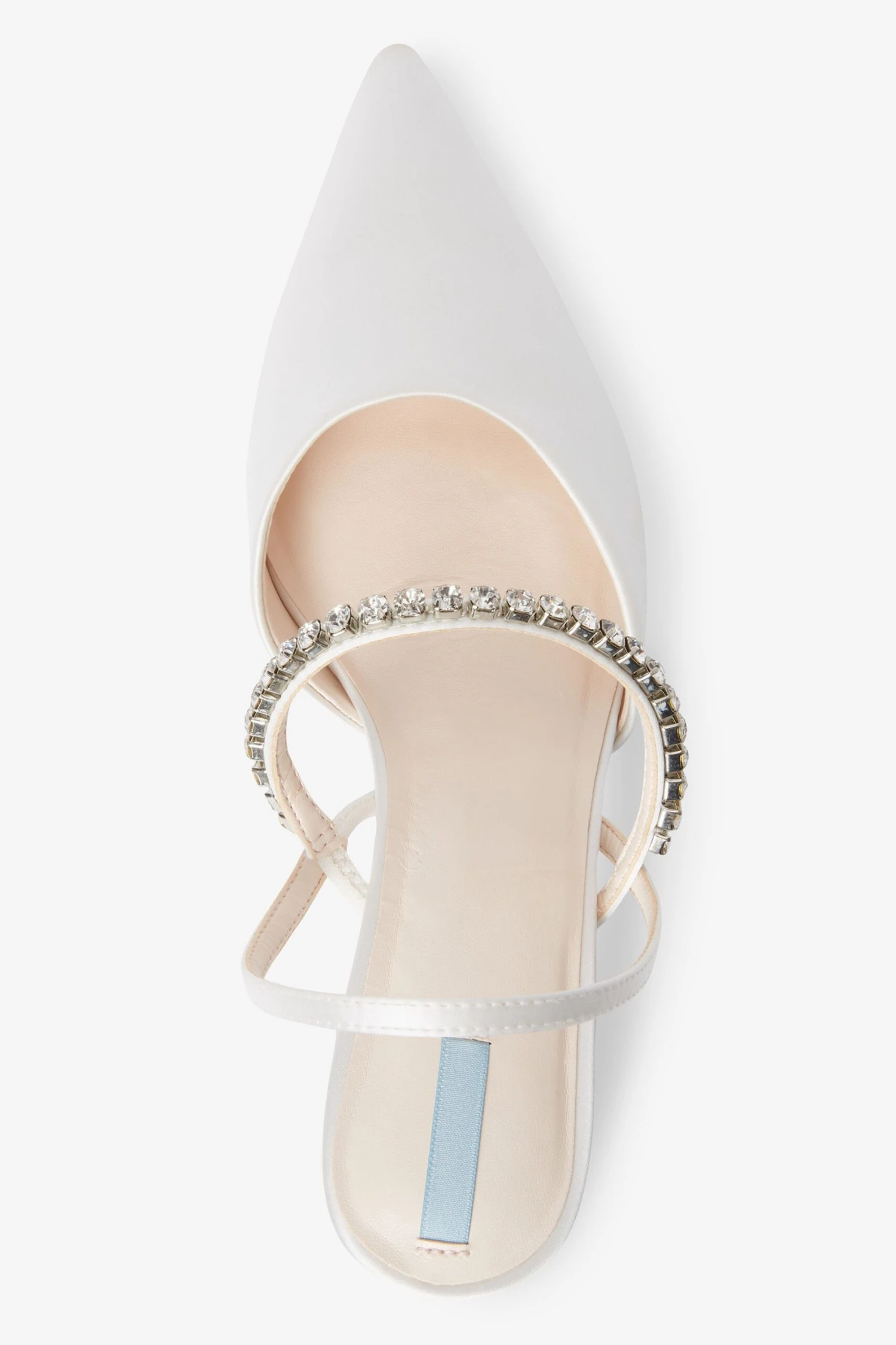 Die hinten offenen Brautschuhe in Elfenbeinfarben sorgen für den optimalen Tragekomfort an diesem besonderen Tag. Das hübsche zweiteilige Design, die zusätzliche Polsterung, das sich an Ihre Füße anpasst, sorgt für optimalen Tragekomfort an diesem besonderen Tag. Der schmucksteinbesetzte Riemen und die spitze Zehenpartie strahlen Eleganz aus.