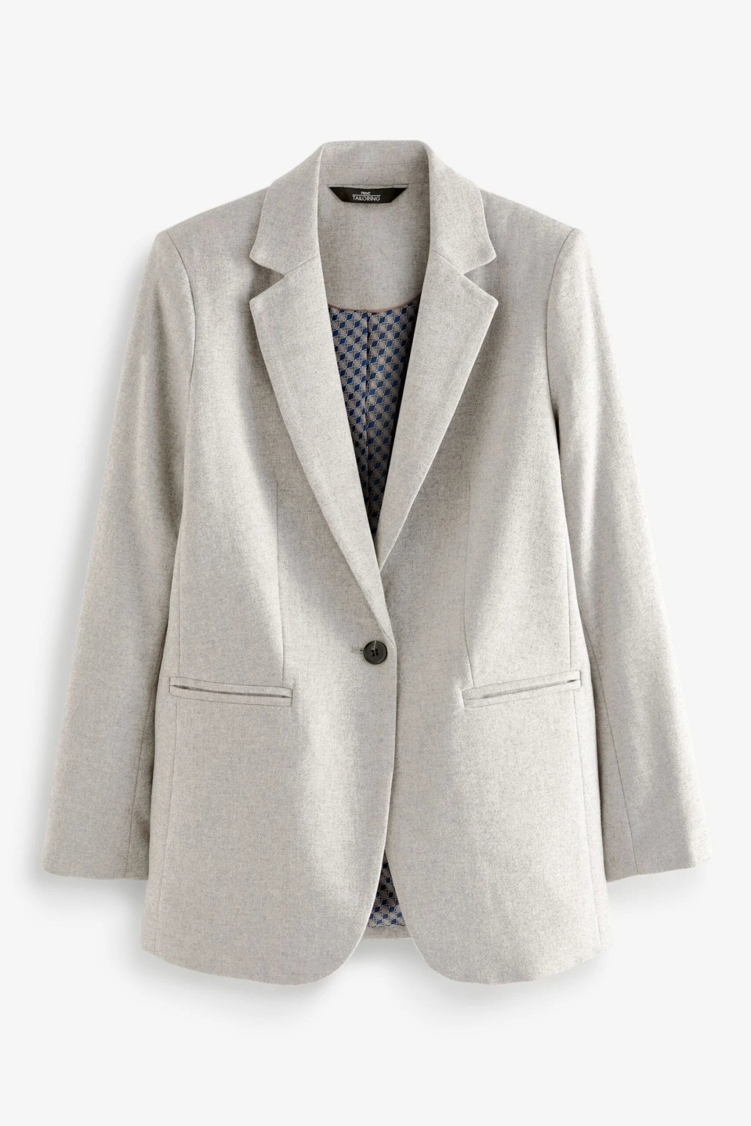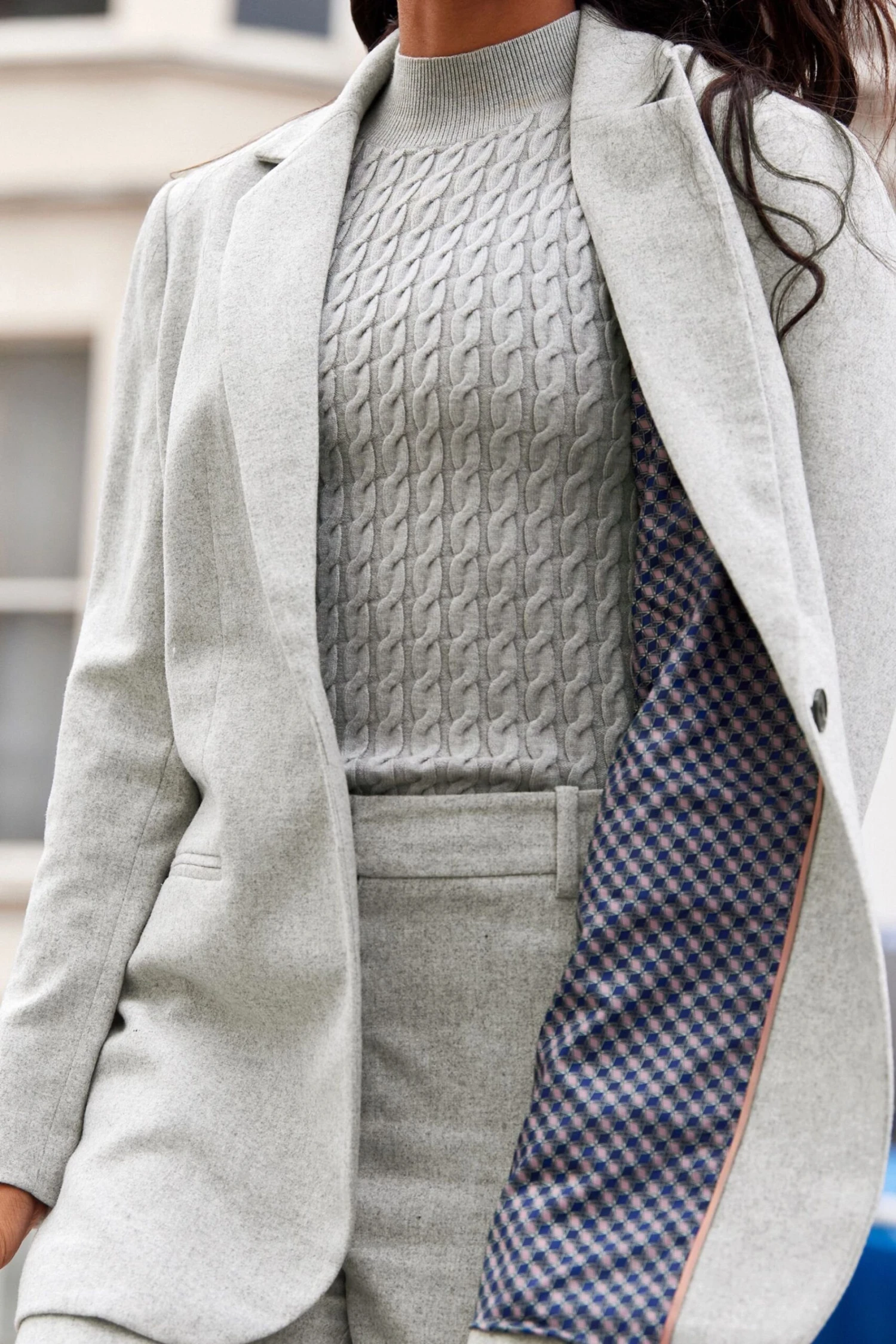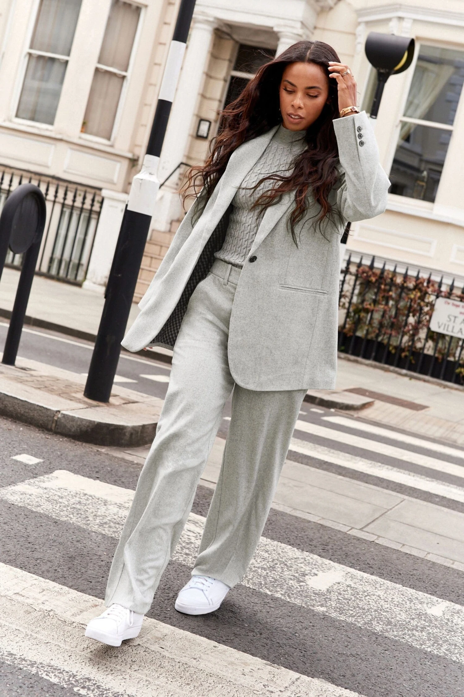 Ein Teil der Rochelle-Humes-Kollektion. Dieser Blazer besteht zu 48 % aus Wolle und hat einen schönen länglichen Schnitt mit nur einem Knopf auf Brusthöhe. Die passende Hose mit weitem Bein ist auch erhältlich.