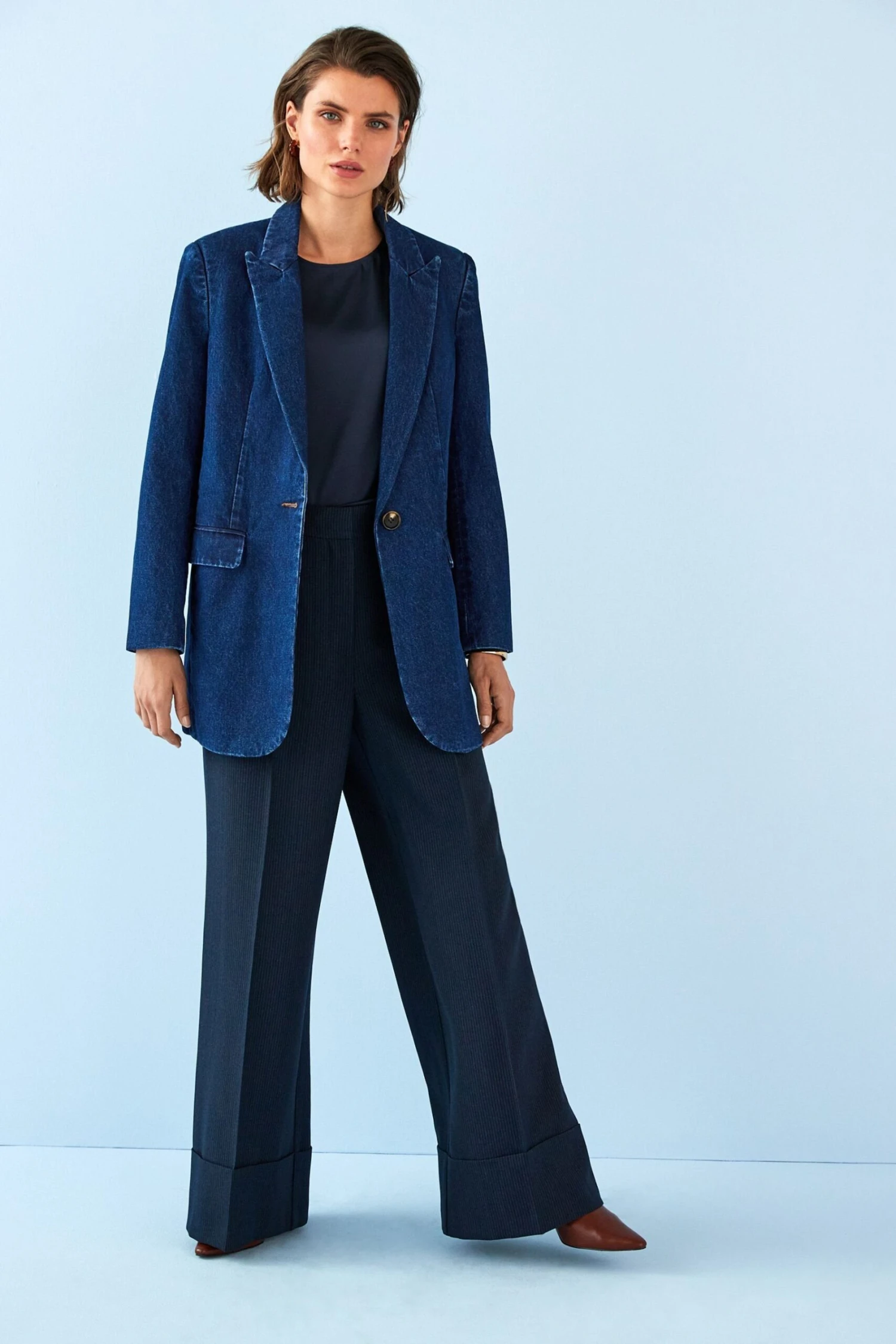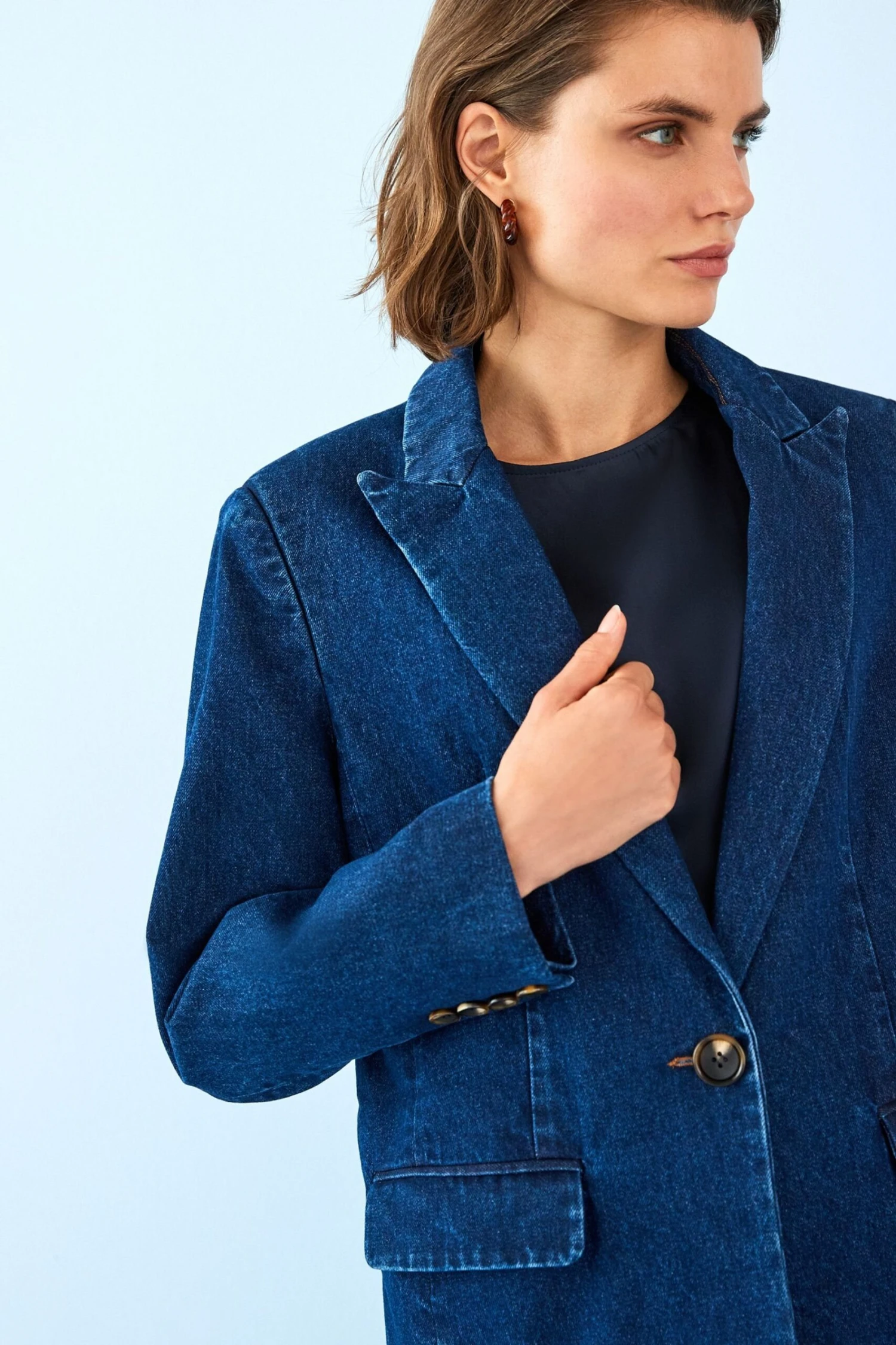 Verleihen Sie Ihrer Garderobe eine herbstliche Aktualisierung mit diesem Denim-Blazer. Er hat ein Revers mit Kerbe und einen einzigen Knopfverschluss, zwei Taschen auf der Vorderseite und geknöpfte Manschetten. Runden Sie den Look mit den passenden Pullover und einer Hose mit weitem Beinschnitt ab.