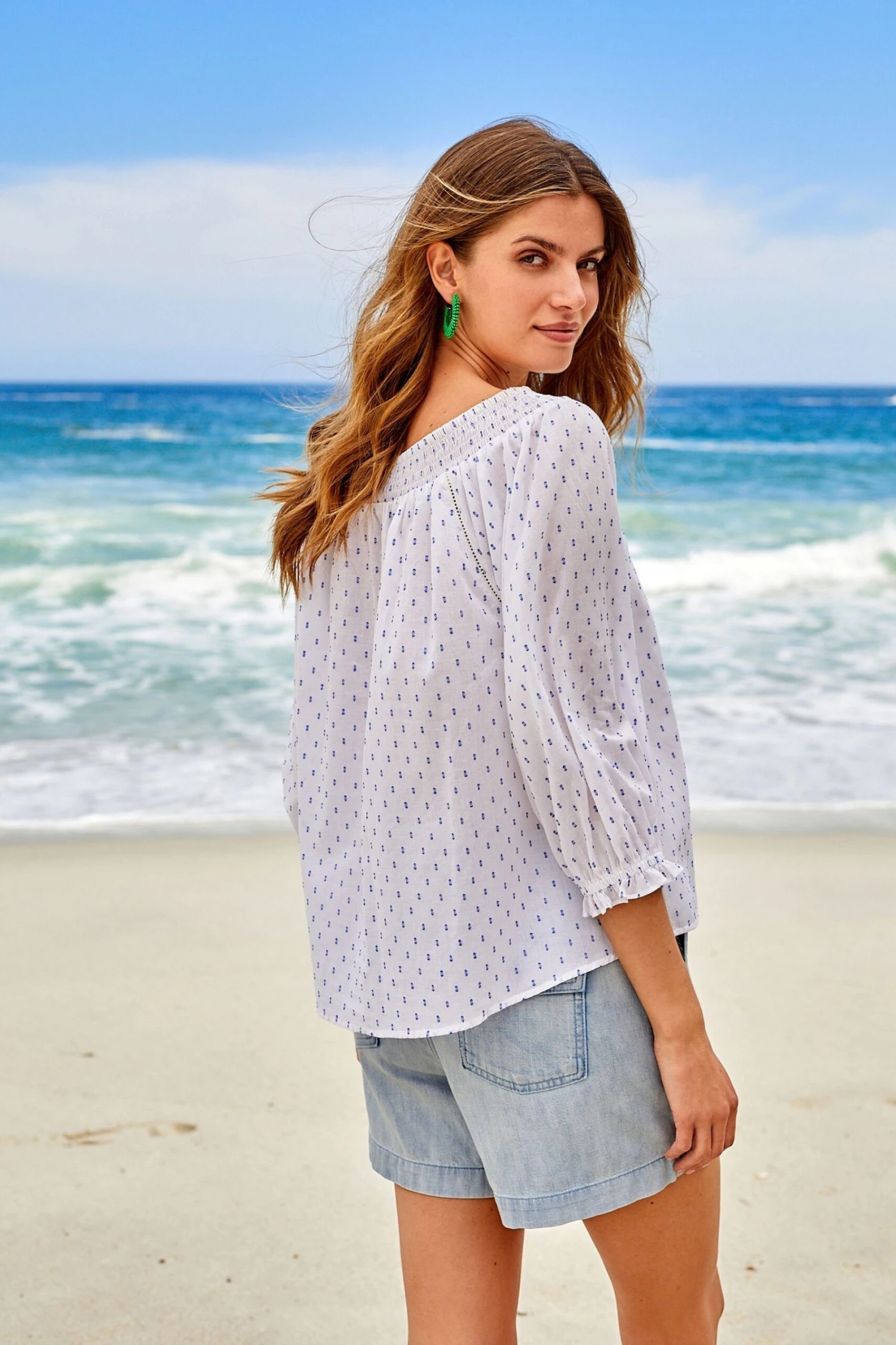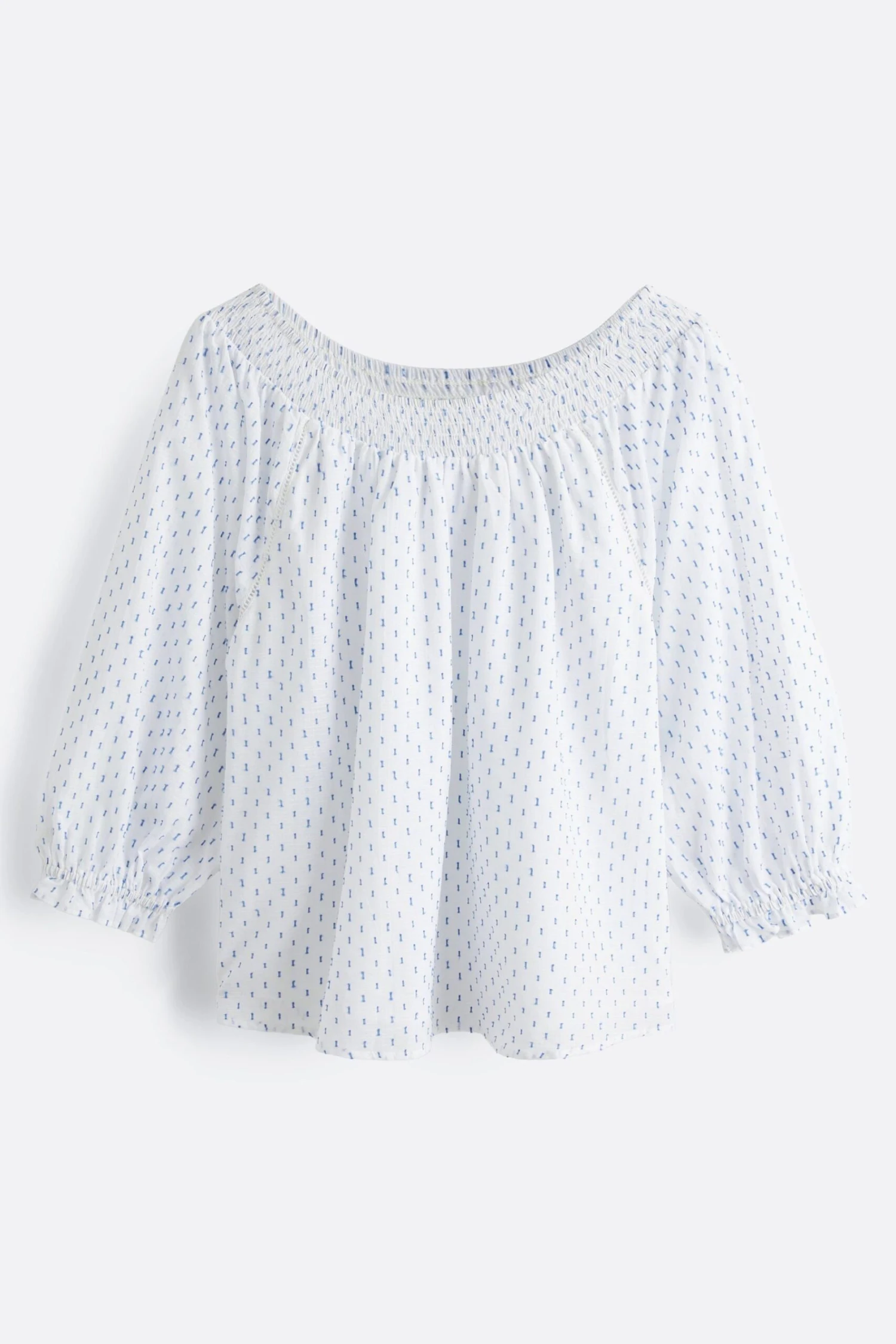 Dieses hübsche Oberteil aus strukturierter Baumwolle mit gesmoktem Ausschnitt kann auf Wunsch auch schulterfrei getragen werden. Mit halblangen Ärmeln und in einer hübschen lockeren Passform.