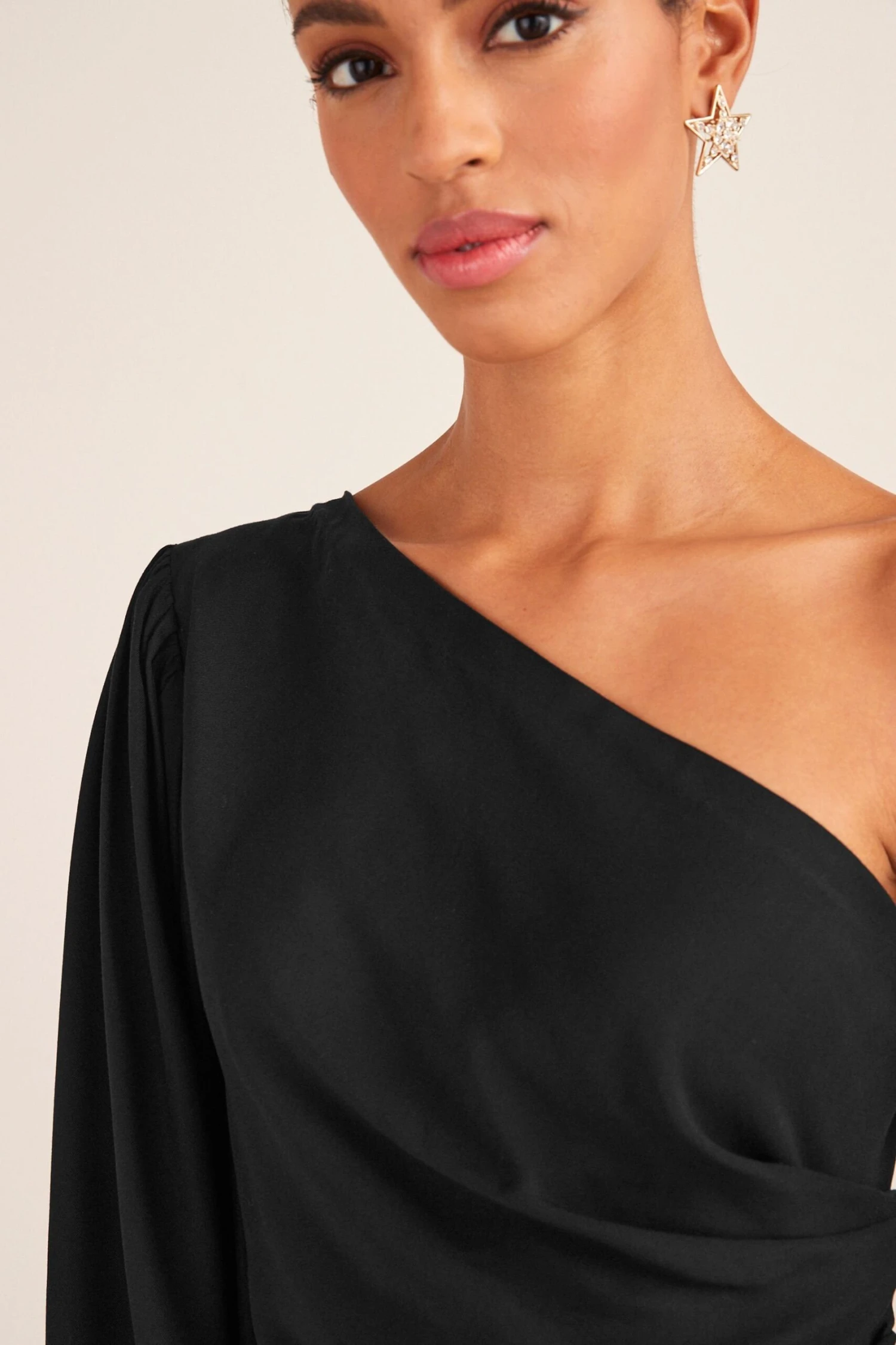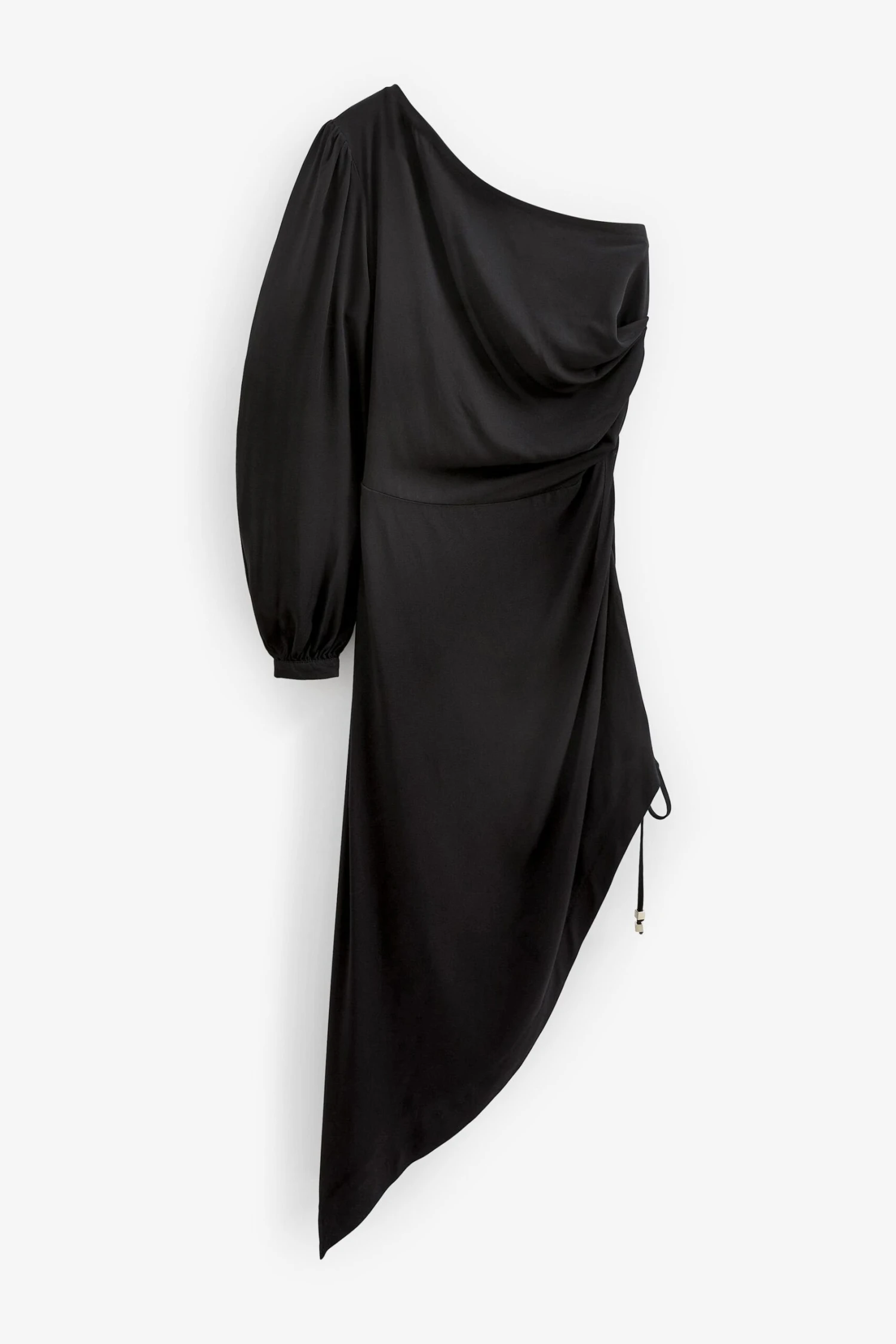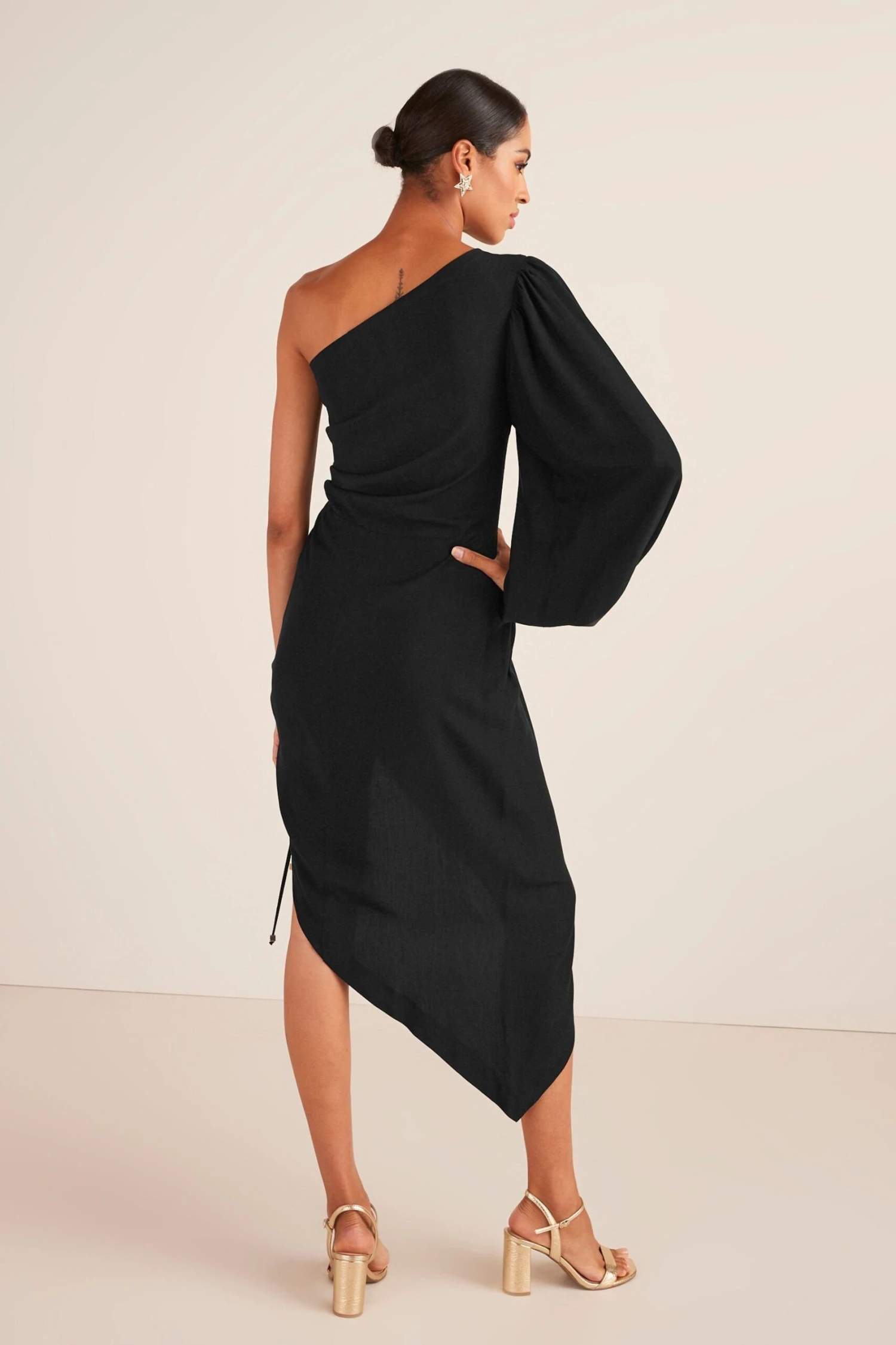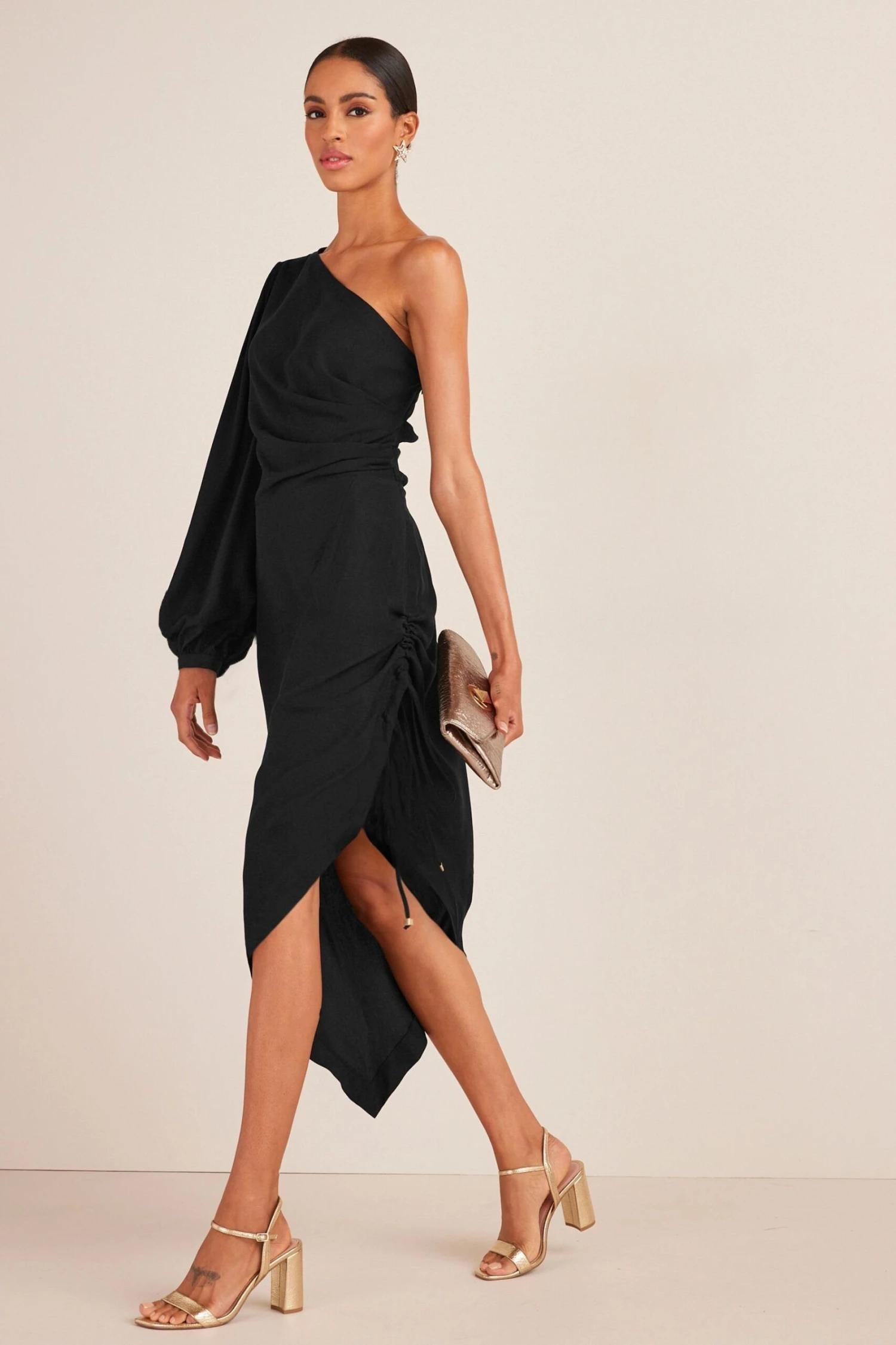 Dieses bezaubernde einschulterige Midikleid ist seitlich elegant gerafft und mit glänzenden Goldbesätzen akzentuiert. Der asymmetrische Saum verleiht diesem Abendoutfit eine glamouröse Note.