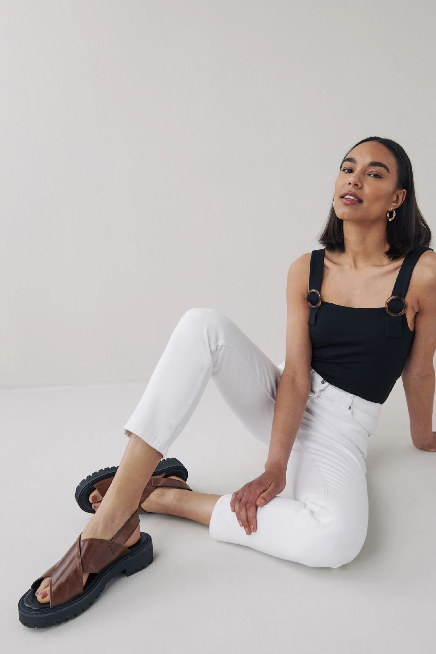 Die Mom-Jeans sitzen hoch und sind im Bein schmal zulaufend geschnitten. Tragen Sie dazu einen Blazer und Turnschuhe für einen legeren Alltagslook.